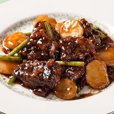 ほんのりとした酸味と深いコクの黒酢だれ。ピリ辛と豚の甘みが絶妙に調和し、トロトロの触感が楽しめます。