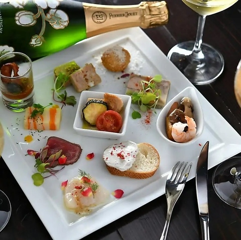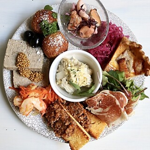 シェフ特製の自家製前菜の盛り合わせ。目にも彩り豊かな絶品オードブル。