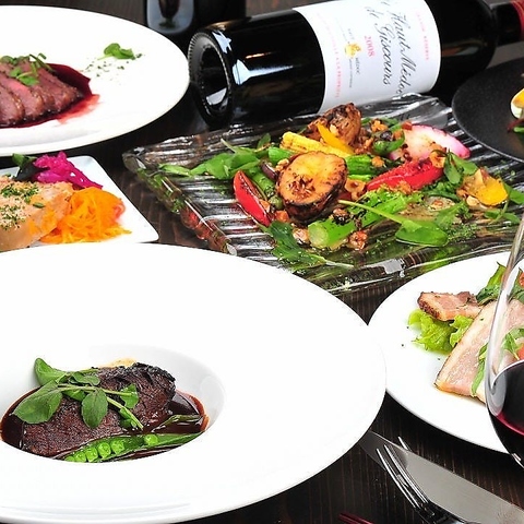鶏せせりとズッキーニのオーブン焼き、太刀魚とナスのフリット、栗豚ウデ肉の煮込みなど、旬の食材を使用した当店自慢の料理を全6品堪能できる人気のコースです。生ビールをはじめ、厳選ワイン、ハイボール、焼酎、カクテル等を飲み放題でお楽しみいただけます。※皆様でシェアできる大皿スタイルでのご提供となります