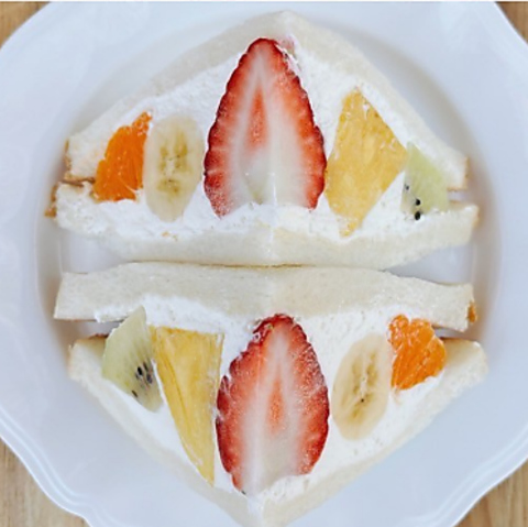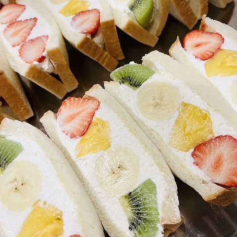 いちご・パイナップル・キウイ・バナナ・グラシアスマンゴー/※ショーケースにご用意しているフルーツサンドをお席でお召し上がりいただけます。店内でお召し上がりいただく場合は、ワンドリンクオーダー制となります。