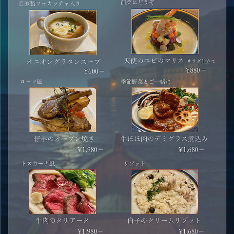 イタリアトスカーナ地方をイメージした、パルミジャーノたっぷりの国産牛ステーキ【タリアータ】を筆頭に【牛ほほ肉のやわらかデミグラス煮込み】【ローマ風・仔羊のグリル】【自家製イカスミソースのリゾット】など、無化調自家製にこだわった逸品多数!