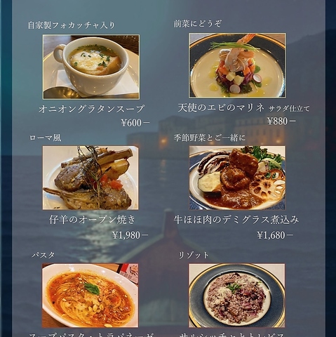 イタリアトラパーニ地方をイメージしたトマト、オリーブ、アーモンド、体に染み渡るスープパスタ【トラパネーゼ】を筆頭に【牛ほほ肉のやわらかデミグラス煮込み】【ローマ風・仔羊のグリル】【自家製イカスミソースのリゾット】など、無化調自家製にこだわった逸品多数!