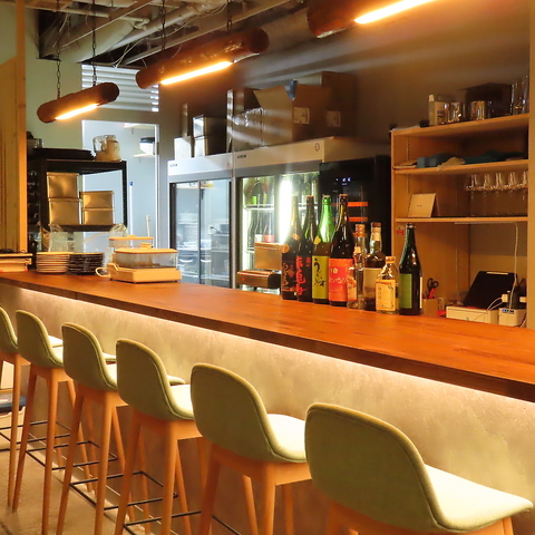 【カウンター席:10名様】カウンター席は、目の前で料理を楽しむ特別な空間。店員との会話も弾み、アットホームな雰囲気でリラックスした時間を過ごせます。おひとり様歓迎!サク飲みにも◎