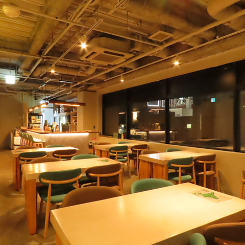 【テーブル席:24名様】すすきの駅より徒歩2分。開放的なテーブル席は、友人や家族との楽しいひとときにぴったり。明るい自然光が差し込む中、心地よい会話と共にお食事を楽しめます。最大50名様まで貸切も対応中♪