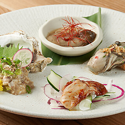 コンフィ、牡蠣キムチ、沖漬け、なめろうを盛り合わせました!日本酒にも白ワインにも合うおつまみです。