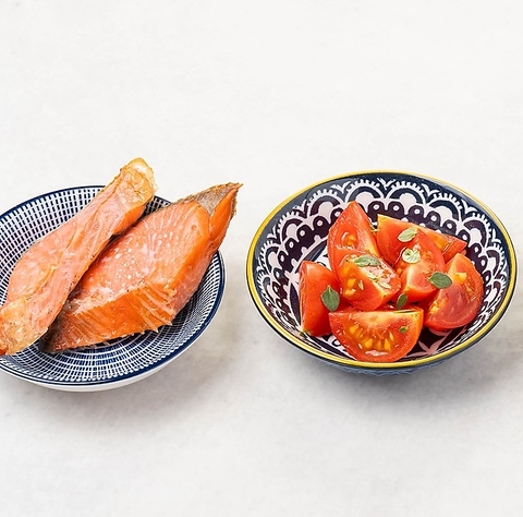 鮭・鶏・煮卵。ごはんが進む和のおかず三品盛り。