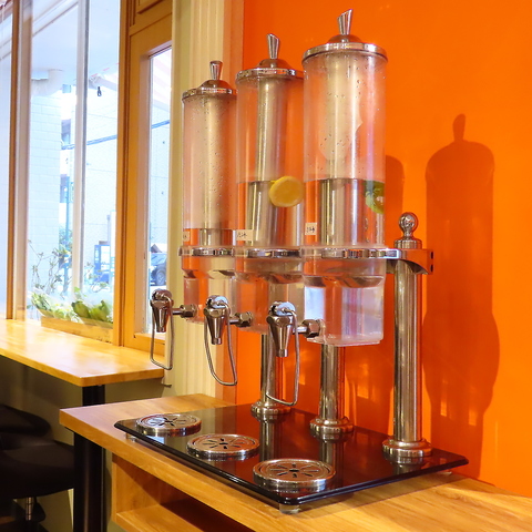 「鮮やかなオレンジの壁に映えるウォーターディスペンサー。レモンやハーブが香るフレーバーウォーターで、食事の合間やひと息つく時間をさわやかに演出します。セルフで気軽に楽しめる、ちょっと嬉しいおもてなし。