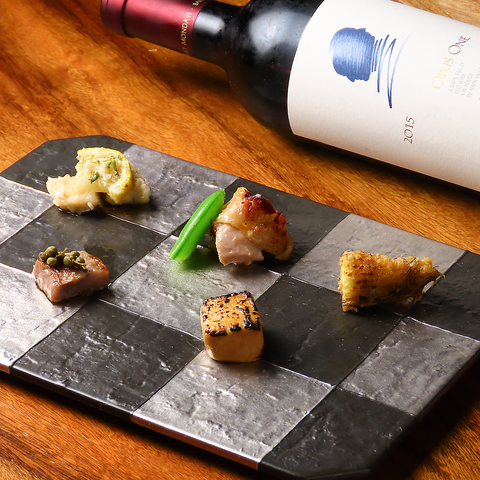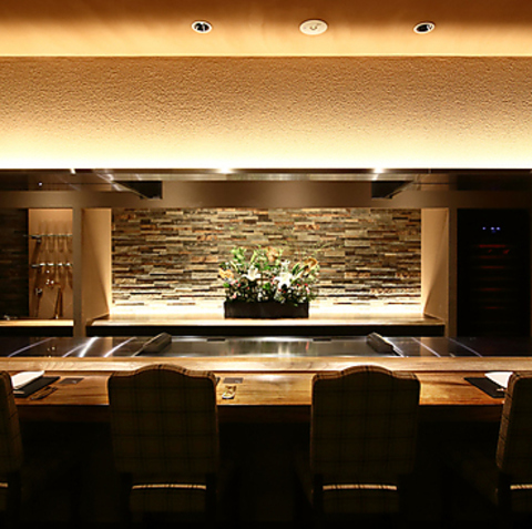 目の前の鉄板で行われる調理風景は、料理人による圧巻のパフォーマンスで目が釘付け。迫力ある特等席のカウンターはいつも人気。落ち着いた雰囲気で記念日デートや接待にもおすすめ。美味しい鉄板焼に合うワインも多数あるので、大人のひとときを楽しんで。
