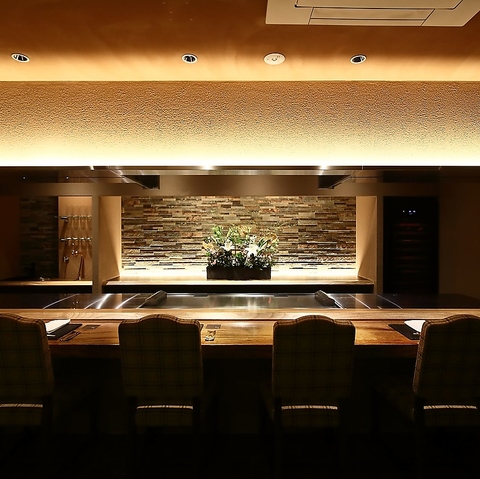 目の前の鉄板で行われる調理風景は、料理人による圧巻のパフォーマンスで目が釘付け。迫力ある特等席のカウンターはいつも人気。落ち着いた雰囲気で記念日デートや接待にもおすすめ。美味しい鉄板焼に合うワインも多数あるので、大人のひとときを楽しんで。