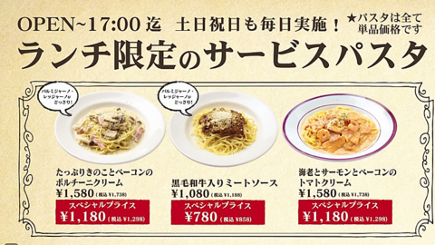 - 【パスタ】パスタ大盛(1.5倍)+440円(税込)/パスタメガ盛(2倍)+660円(税込)