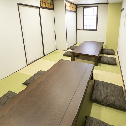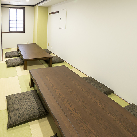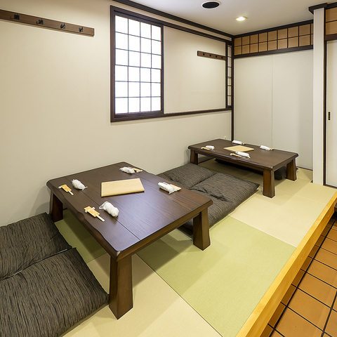 【高級感のある座敷席】4名掛けの座敷席は、落ち着いた雰囲気の中でプライベートな食事を楽しめます。和のテイストを大切にしたデザインは、心地よい安らぎを提供し、特別なご宴会や大切な方との会食に最適です。20名様以上で貸切のご対応も承っております。