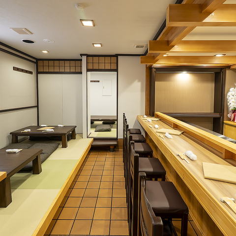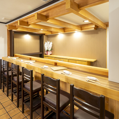 【落ち着いた雰囲気漂うカウンター席】当店はカウンター席を7席ご用意しており、目の前で繰り広げられる職人の技を間近に感じられます。落ち着いた雰囲気の内装は、静かな時間を演出し、心地よい会話を楽しむのに最適な空間です。