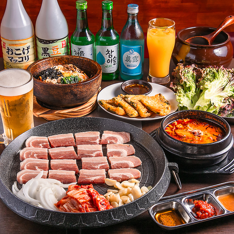 当店人気!サムギョプサル食べ飲み放題コースをご用意しております☆コースの内容はサムギョプサル食べ放題の基本コースの他、基本コースにビビンバやチゲ、チヂミ、チーズタッカルビ、冷麺なども楽しめるコースを各種取り揃えております。飲み放題も付いて大満足の内容です♪※注文は2名様から