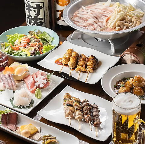 2時間飲み放題付きのコースもご用意!料理は旬の食材をふんだんに使用するため、おまかせコースとなっております♪新鮮な魚介のお造りや、焼き鳥盛合せなど、お酒にも合う料理が勢揃い。ご友人とのお食事会や会社の集まり、各種宴会など幅広いシーンでご利用ください!