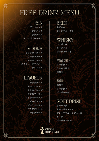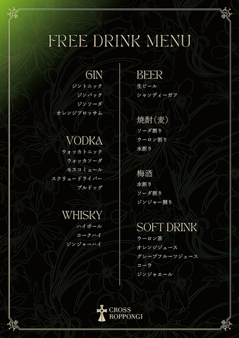 | +500円(7500円)で追加 | カシスソーダ、カシスオレンジ、カシスグレープ、カシスウーロン、ファジーネーブル、ピーチフィズ、ピーチウーロン、マリブオレンジ、マリブコーク |