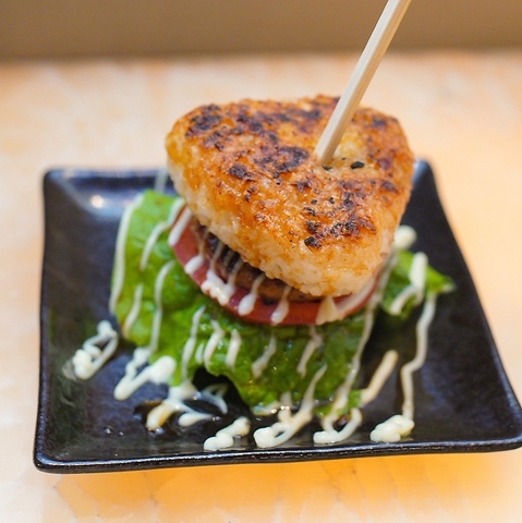 当店こだわり「さすけのライスバーガー」はバンズに焼きおにぎりを使用!炭火で香ばしく焼いた逸品です♪