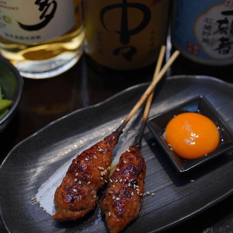 自家製【月見つくね(2本)】は外は香ばしく、中は旨味滴るジューシーな逸品!卵黄を絡めてどうぞ♪
