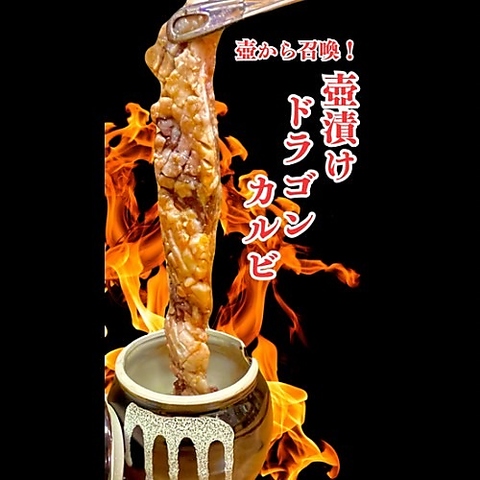 豪快な見た目と濃厚な旨みで、焼肉の主役にふさわしい一品!厳選された牛カルビを、特製の秘伝ダレにじっくり漬け込み、壺の中で熟成させることで、肉の旨みとタレのコクが絶妙に絡み合います。まるで“ドラゴン”のような力強い味わいと、ジューシーな食感が特徴。焼いた瞬間に香ばしい香りが広がり、食欲を刺激します。