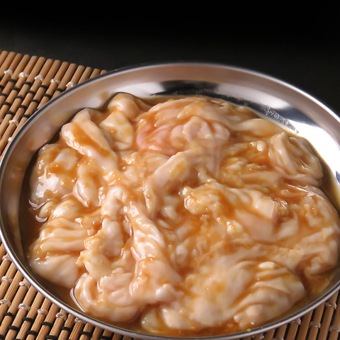【当店の看板メニュー】自家製のタレをもみこんだ絶品豚ホルモン。浜松でホルモンといえばこれ!の味です。脂の甘みと香ばしさが焼くことで引き立ち、噛むほどにあふれるコクが食欲をそそります。