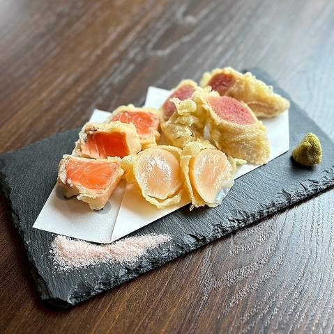 冷凍していない新鮮な生サーモン、博多明太子、北海道の帆立貝柱を使用しています。これらの食材は、見た目にも美しい仕上がりで、写真映えすること間違いなし!特に博多明太子は一本丸ごと揚げて提供しておりますので、インパクトのある見た目が食欲をそそります。メニューに迷ったらまずはこちらをご注文ください!