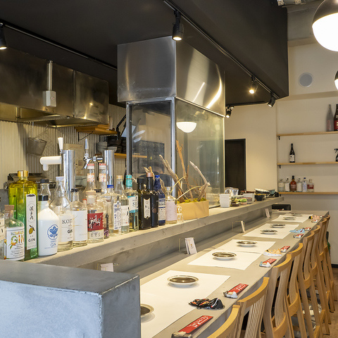 当店は12席のL字カウンターのみとなっておりますが、天井が高く開放感溢れる空間となっております。カウンターの中には囲炉裏があるため、目の前で魚や野菜などを焼く臨場感をお楽しみいただけるのが特徴です。店内は上品で落ち着いた雰囲気ですので、仕事終わりやデートなど様々なシーンで気軽にお立ち寄りください。