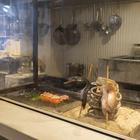 カウンター席の中にある調理場、その一角に当店おすすめの炭火で焼く原始焼きを行うスペースがあります。目の前で焼くそのスタイルは、囲炉裏に似た温かさを感じる風情があります。お魚が焼きあがる様子を見ているだけで心地よく、パチパチと焼きあがる音を聞きながら食べる料理は何とも言えない趣を感じることができます。