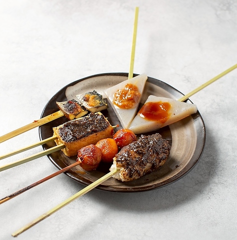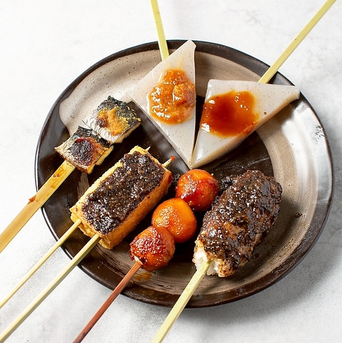 <こんにゃく・厚揚げ・他三本は選択>味噌の香ばしさが引き立つ田楽セット。定番のこんにゃくと厚揚げに加え、お好みの三本を選べる、満足感たっぷりの一皿です