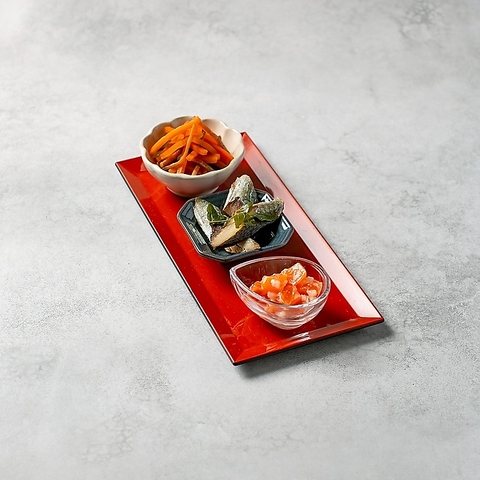 <いかにんじん・ニシンの山椒漬け・紅葉漬け>福島の郷土料理を味わう三点盛り。シャキシャキ食感のいかにんじん、旨味広がるニシンの山椒漬け、風味豊かな紅葉漬けを一皿でお楽しみいただけます。