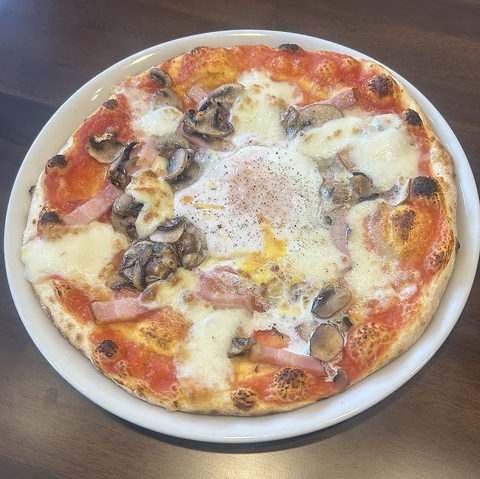 半熟卵に、ベーコン、マッシュルーム、熱々のモッツァレラのコンビがたまりません!