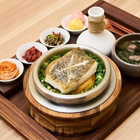 注文が入ってから炊き上げる釜飯に、香ばしく焼き上げた鮭と、濃厚なイクラをふんだんにのせた、贅沢な海の幸の釜めし。釜飯は、よくかき混ぜてから取り皿に移してください。残ったおこげには熱々の牛スープを注ぎ、蓋をして「ヌルンジ」を作ります。お好みで塩、ワサビ、タテギ(万能辛味調味料)を加えてお楽しみください。