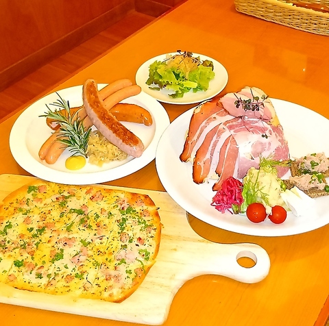 生ハムやチーズの前菜盛り合わせ、サワークラウトのサラダ、ドイツの薄焼きピザ「フラムクーヘン」、定番人気のソーセージ盛り合わせまで揃った気軽なコース。飲み放題付きなので、普段の食事はもちろん、地元の仲間との集まりや軽めの飲み会にもぴったり。カジュアルに楽しめる内容です。