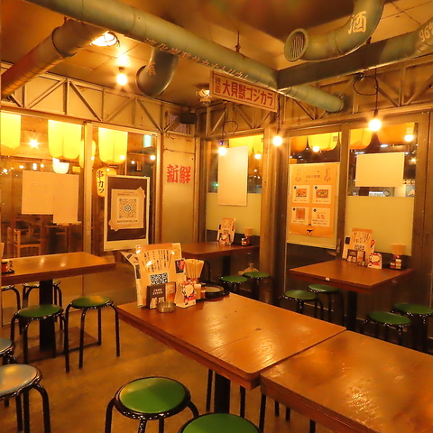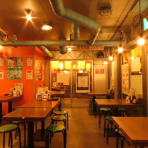 木目調のテーブルにカラフルな丸椅子が並ぶ、活気あふれるカジュアルな空間です。お一人様でも気軽に立ち寄れるカウンター席や、グループで賑やかに過ごせるテーブル席を完備しています。レトロで温かみのある照明が心地よく、仕事帰りの一杯や友人との語らいに、つい長居したくなるアットホームな雰囲気が魅力です。