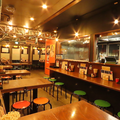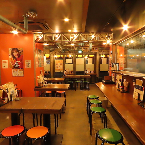 賑やかで親しみやすい店内は、オレンジ色の壁やレトロな照明が温かみを添える、居心地の良い大衆的な雰囲気です。お一人様歓迎のカウンター・テーブル席など、最大65名様まで対応可能な広々としたお席まで完備。貸切相談も承っており、大人数での宴会から仕事帰りの一杯まで、幅広いシーンで気取らずに楽しめます。