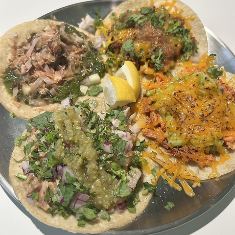 無添加・グルテンフリーの100%メキシコ産トルティーヤを使った自慢のタコスをご堪能ください!生地はとうもろこしの風味が感じられメキシコの味と香りをお楽しみいただけます♪具材は、長時間じっくり低温調理した肉や地元の農家から直接契約で仕入れるパクチーなどを使用。ソースは、メキシコの食材とスパイスを使った自家製サルサです。