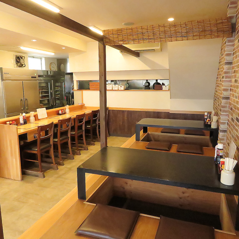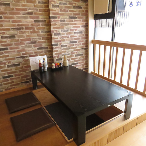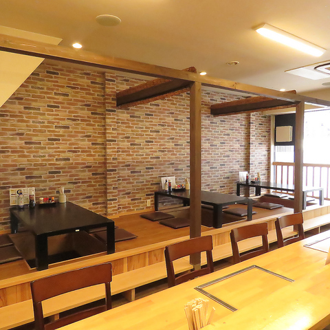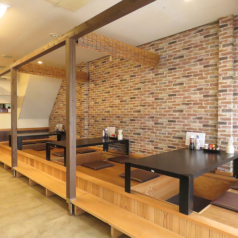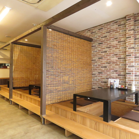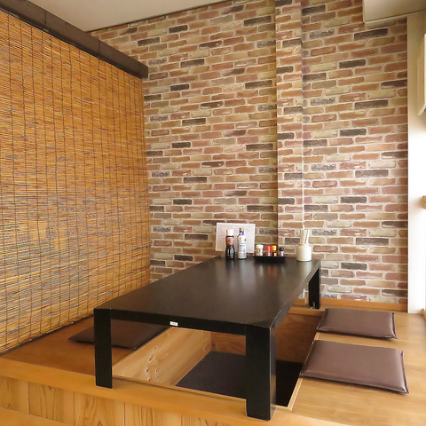 居心地のいい空間作りが魅力。壁には温かみのあるレンガ調のタイルが施され、落ち着いた雰囲気になっています。掘りごたつのようなテーブル席はプライベート感があり、ご友人やご家族との会話を楽しむのにおすすめです。また間仕切りには竹のカーテンが使われており、周りを気にせずお過ごしいただけます。