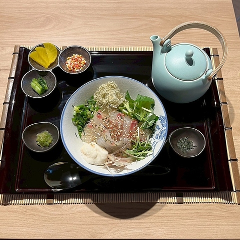築地市場から仕入れた新鮮な鯛を贅沢に使った、当店自慢の鯛茶漬け。お茶屋が手掛ける本気のお茶漬けで、割り下にもお茶を使用しているため、深い味わいが楽しめます。鯛の旨味とお茶の風味が絶妙に調和し、一口食べれば心が和むような優しい味わいです。
