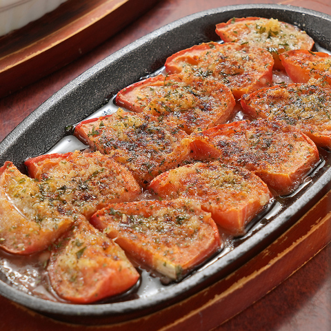 ステーキをご提供する鉄板プレートに、輪切りのトマトを豪快に並べた「トマトのオリーブ焼き」は、とにかくお酒が良く合う一品料理♪にんにくとオリーブオイルがしっかりとトマトに絡み、トマトの下にはこんがり焼けたベーコン!さっぱりといただけるのに満足感のある、お酒のあてにピッタリなメニューです♪