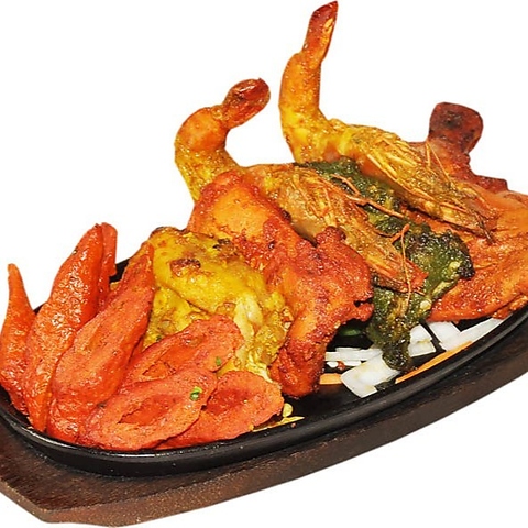 タンドリーチキン1P・チキンティッカ1P・シークカバブ1P・ガーリックティッカ1P・ハリヤリティッカ1P・ タンドリープロウン2P ※ミックスグリル注文のお客様は生ビール1杯300円(税込)