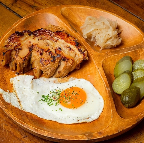 香ばしく焼き上げられた分厚いチャーシューは食べ応え抜群!その下には半熟に焼かれた目玉焼きがとろ~り、黄身を輝かせています。お肉の旨味と黄身のコクが口の中で混ざり合い至福のハーモニーを奏でます。ザワークラウトとピクルスも、箸休めにぴったり。定食屋さんの人気メニューがお酒と一緒に楽しめる一皿です。
