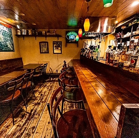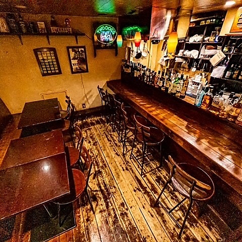 温かみのある照明が灯る店内は、まるで時が止まったかのようなレトロな雰囲気。足元に広がる年季の入った木製フローリングは、このお店が積み重ねてきた歴史を物語っているよう。壁に飾られたヴィンテージ感あふれるポスターや、ネオンサインがアクセントになり、遊び心も満載◎