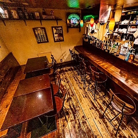 温かみのある照明が灯る店内は、まるで時が止まったかのようなレトロな雰囲気。足元に広がる年季の入った木製フローリングは、このお店が積み重ねてきた歴史を物語っているよう。壁に飾られたヴィンテージ感あふれるポスターや、ネオンサインがアクセントになり、遊び心も満載◎