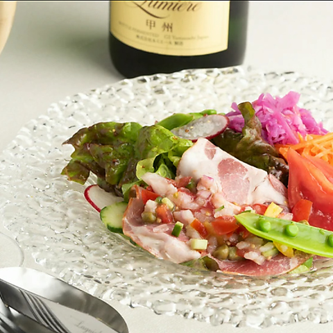 生ハムとフレッシュな野菜の盛り合わせ。生ハムは、飼料にマロングラッセの原料となる栗を与え、健康的に育てられたスペインの栗豚を使用。あえてメインをオーダーせず、こちらの一皿+パンをワインと楽しむのもオススメです。