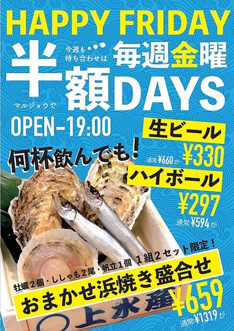 【予約はクーポンから】生ビール660円→330円,ハイボール594円→297円,浜焼き盛り合わせ1319円→594円