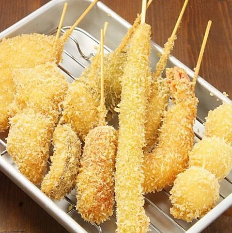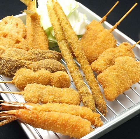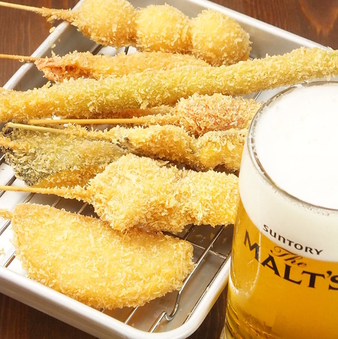 カラっと揚がった各種串揚げは、特製ソースと絶妙なマッチング!ソースの二度漬けは禁止です♪