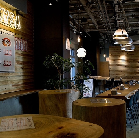 店内にはカウンター席や立ち飲み席の他、テーブル席とソファー席があり、くつろぎながら食事を楽しむこともできます!木の温もりを感じるインテリアが心地よく、開放的なデザインが魅力的♪おしゃれな照明が落ち着いた雰囲気でリラックスした時間が過ごせること間違いなし!!