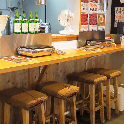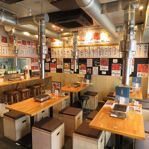 どこか懐かしい雰囲気の空間は、ワイワイと賑やかなお食事にぴったり♪店内はカウンター席、テーブル席でゆったりとお楽しみいただけます。ご友人同士でのお食事や各種ご宴会など、幅広いシーンにご利用ください♪また、椅子の下に荷物入れをご用意。紙エプロンやしっかりとした排煙設備で、匂いも気にせずにお食事いただけます。貸切もOK!