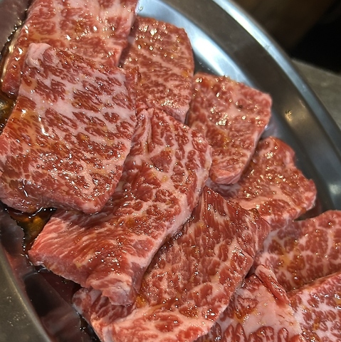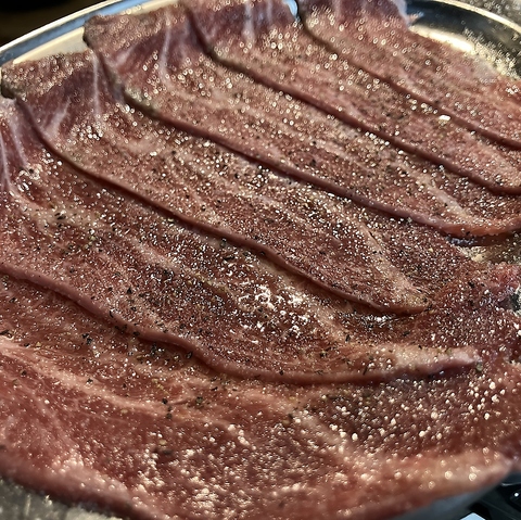 【焼肉はるくん。】の看板商品、名物【はるくん。カルビ】。上質な脂がクセになる・・・!リピーター様から大好評のはるくんカルビを是非ご堪能ください!【焼肉 居酒屋 津田沼駅 津田沼 肉 女子会 さく飲み 深夜 ビール 宴会】