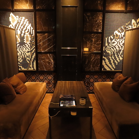 黒を基調とした高級感のある内装に、ゴールドの照明アクセサリーがラグジュアリーな雰囲気に。落ち着いた店内でゆったりとお過ごしください。貸切宴会や結婚式2次会に♪
