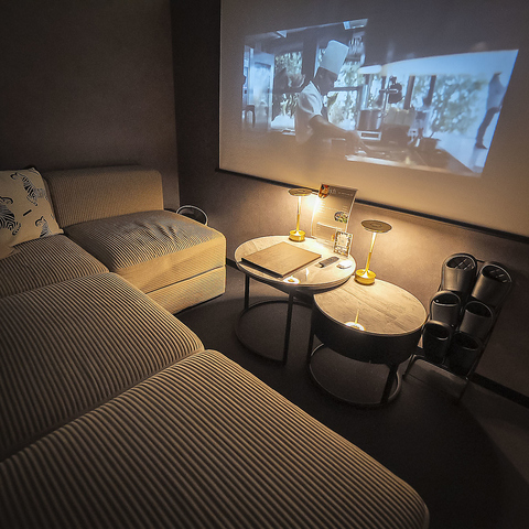 シアタールームは足を延ばしてくつろげるスポットで、ゲーム機や動画サブスクも視聴可能◎4名様で快適に過ごせます!壁一面印象的な美しいブルーに囲まれた個室はSNS映えを意識した空間★撮影用のライトも完備しており、写真撮影や女子会にも最適なスペースとなっています♪
