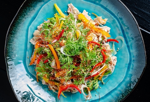 しゃぶしゃぶしたお肉と彩り豊かで美しい野菜のサラダです。季節や仕入れに応じて野菜が変わります。